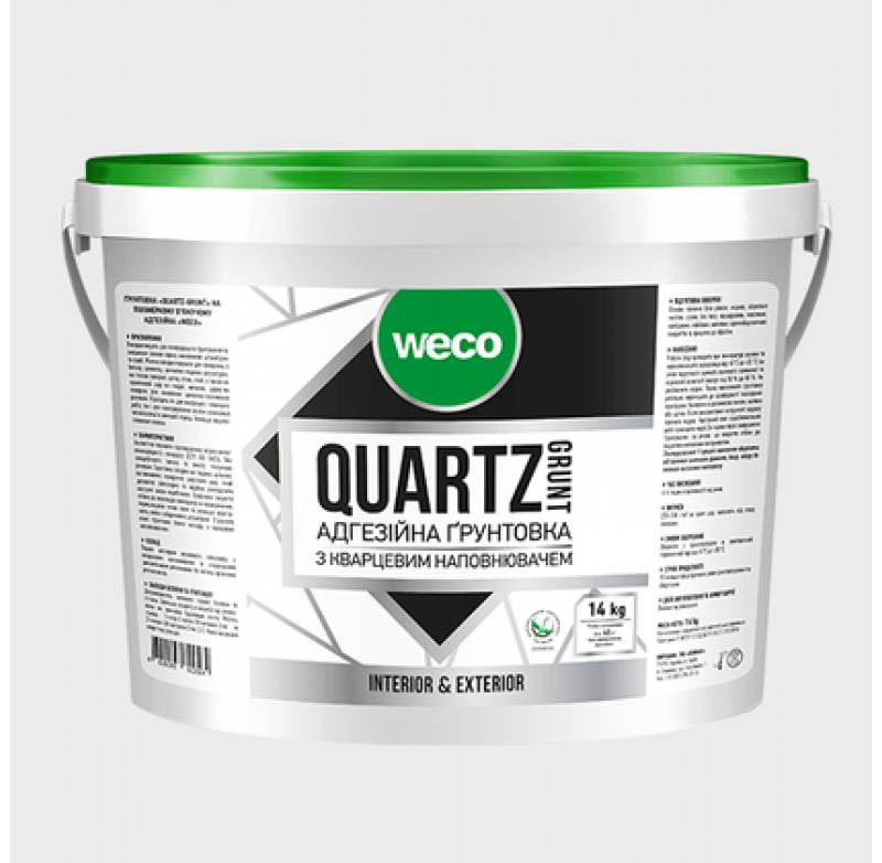Ґрунтовка адгезійна “QUARTZ-GRUNT” ТМ “WECO” (“Кварц Ґрунт” ТМ “ВЕКО”) – це продукт на полімерному в'яжучому з кварцевим наповнювачем, що використовують для попереднього ґрунтування та зміцнення основи перед нанесенням штукатурок та фарб. Можна використовувати для поверхонь з бетону, цементну, вапна, цементно-піщаних штукатурок, на гіпсові поверхні, цеглу, стіни, стелі, а також як проміжний шар на гладкі, металеві, дерев’яні поверхні для нанесення цементно-полі - мерних розчинів.