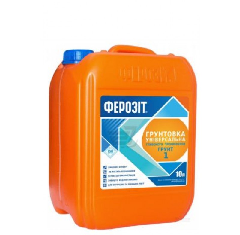 Ферозіт Грунт 1 - універсальна грунтовка глибокого проникнення на основі акрилової дисперсії з ультрадрібними частинками для обробки штукатурок, бетону, гіпсокартону, ДСП перед їх фарбуванням, шпаклюванням чи наклеюванням шпалер для покращення адгезії, зменшення водопоглинання основи, зменшення витрат оздоб-лювальних матеріалів. Особливо ефективна для закріплення слабких основ. Для внутрішніх та зовнішніх робіт.
