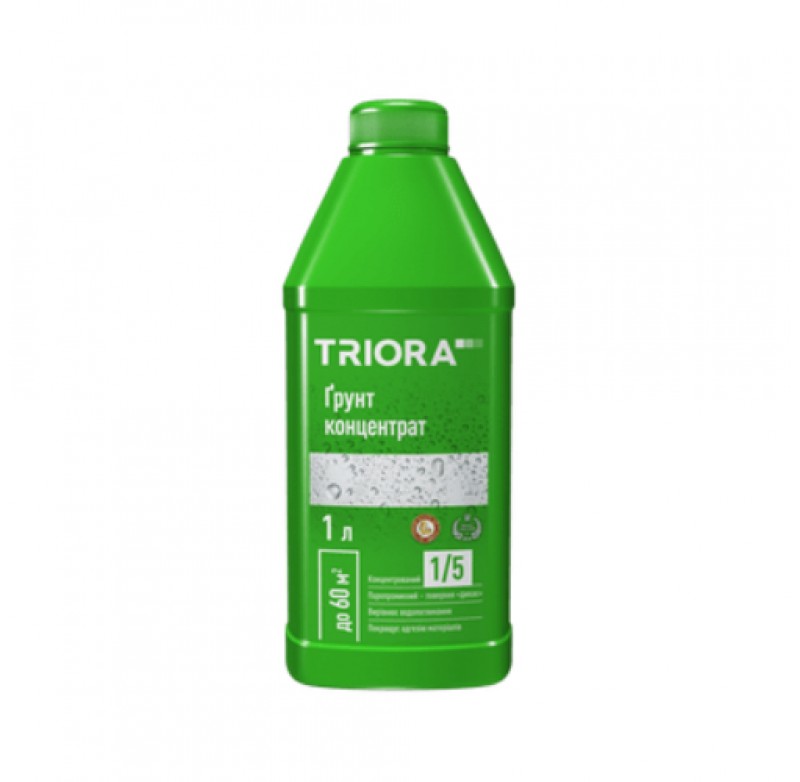 Ґрунт-концентрат 1/5 TRIORA – матеріал високої концентрації. Рекомендують таку ґрунтовку купити, якщо в приміщенні необхідно обробляти різні за станом поверхні. З одного матеріалу можна зробити насичений ґрунт для пухких стін та ґрунтовку слабкої концентрації — для нормальних поверхонь, які слабо вбирають матеріали.Призначена для підготовки поверхні всередині та зовні приміщення. Використовується на бетонних, оштукатурених, цегляних, гіпсокартонних поверхнях перед усіма видами ремонтних робіт: фарбуванням водораслетоворимими фарбами, поклейкою шпалер, шпаклюванням, облицюванням керамічною плиткою та іншими видами робіт.