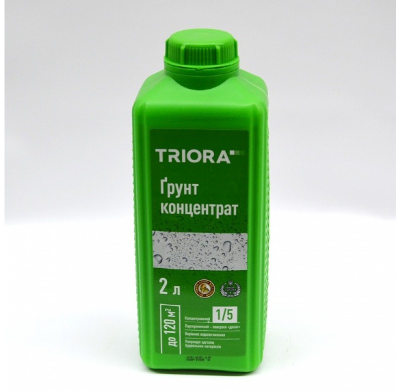 Ґрунт-концентрат 1/5 TRIORA – матеріал високої концентрації. Рекомендують таку ґрунтовку купити, якщо у приміщенні необхідно обробляти різні за станом поверхні. З одного матеріалу можна зробити насичений ґрунт для крихких стін і ґрунтовку слабкої концентрації – для нормальних поверхонь, які слабо вбирають матеріали. Ґрунт-концентрат – раціональне придбання для поточного ремонту.