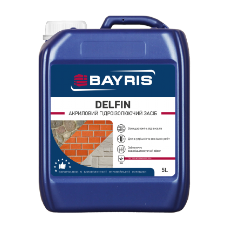 Гідроізолюючий засіб "DELFIN" ТМ "Bayris" ("ДЕЛЬФІН" ТМ "Байріс") на акриловій основі призначений для покриття поверхонь тонким гідроізоляційним шаром в об'єктах реконструкції та новозведених будинках і спорудах різного призначення з метою підвищення їх надійності та довговічності. Продукт "Байріс" "Дельфін" наноситься для захисту від руйнівного впливу води на бетонні, залізобетонні, кам’яні, цегляні, азбестоцементні, а також на цементно-піщані штукатурні покриття та огорожі. У підвалах та заглиблених приміщеннях може застосовуватись як проміжний шар під гідроізоляційні матеріали. Для внутрішніх та зовнішніх робіт.
