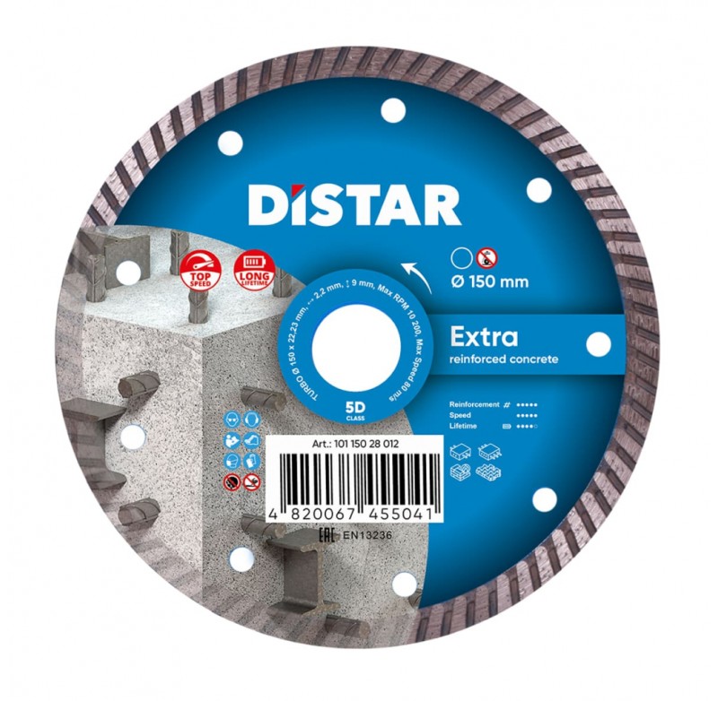 Алмазний відрізний диск DISTAR TURBO EXTRA застосовується для обробки твердих матеріалів, один з найкращих ТУРБО-дисків для різання бетону (як армованої, так і неармованої), всіх видів цегли включаючи вогнетривку, пісковика, а також тротуарної плитки. М'яке комфортне різання. Диск здатний забезпечувати максимально надійну роботу протягом усього терміну експлуатації, при досить високому рівні продуктивності. Додаткове ефективне охолодження диска забезпечується за рахунок отворів у диску. Коло має діаметр 150 міліметрів, при товщині алмазного шару 2,2 мм і висоті 9 мм. Використовується на різних кутошліфувальних машинах із посадковим місцем 22,2 мм та швидкістю роботи до 8500 оборотів за хвилину.