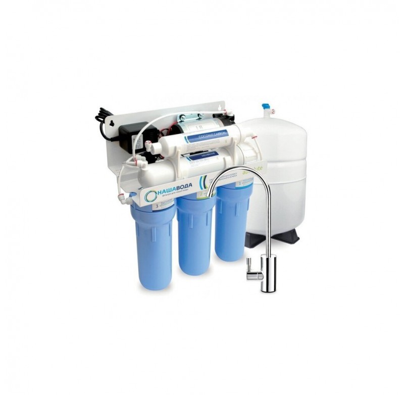 Наша Вода 5-50 Р - це п'ятиступінчаста система зворотного осмосу, яка призначена для підготовки ультрачистой питної води з водопровідної системи. Продуктивність установки - 200 літрів за добу.