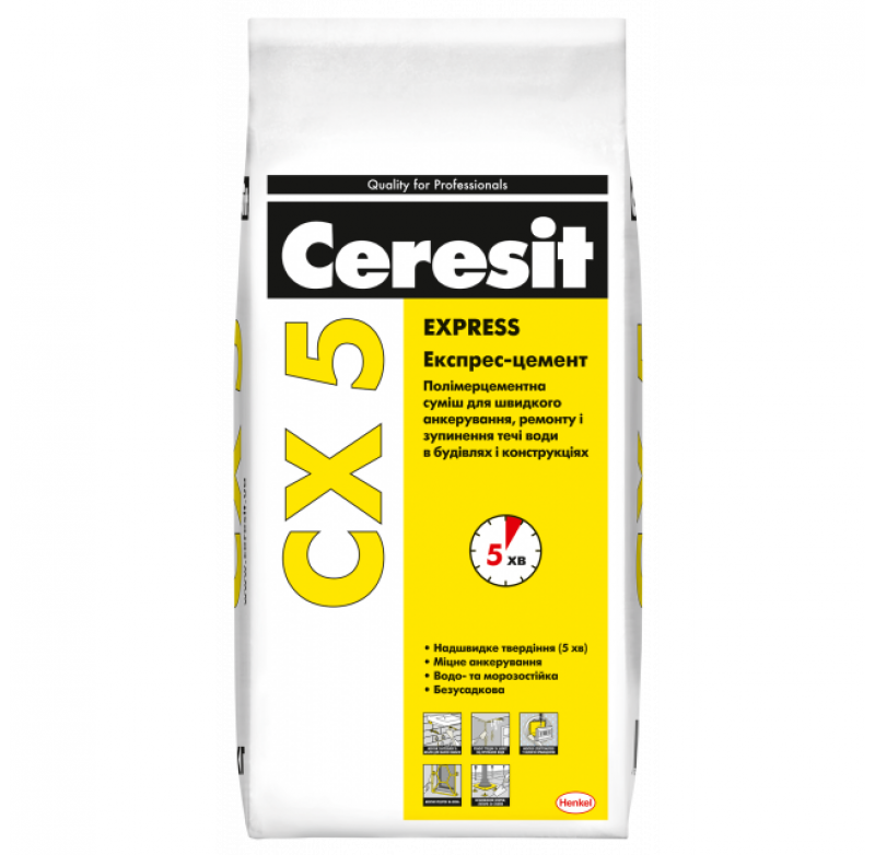 Суха суміш Ceresit CX 5 призначена для анкерування металевих і пластикових деталей у бетоні, кам'яному або цегляному муруванні, ремонту та зупинення протікання води в конструкціях будівель і споруд.
