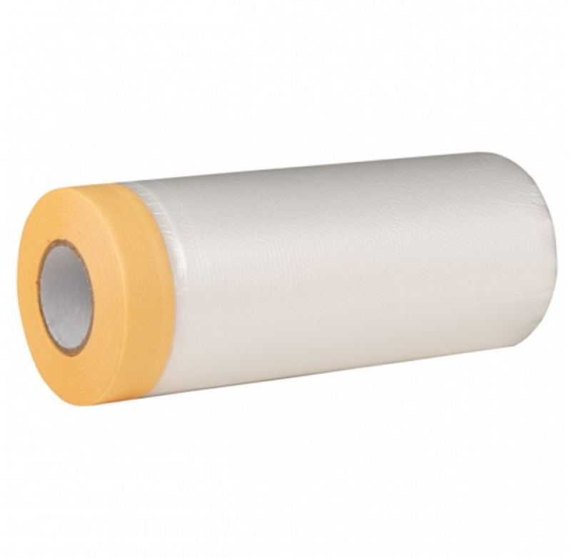 Захисна плівка з малярною стрічкою 550 мм х 20 м підходить для лакофарбових робіт і захисту площі, що не підлягає фарбуванню.