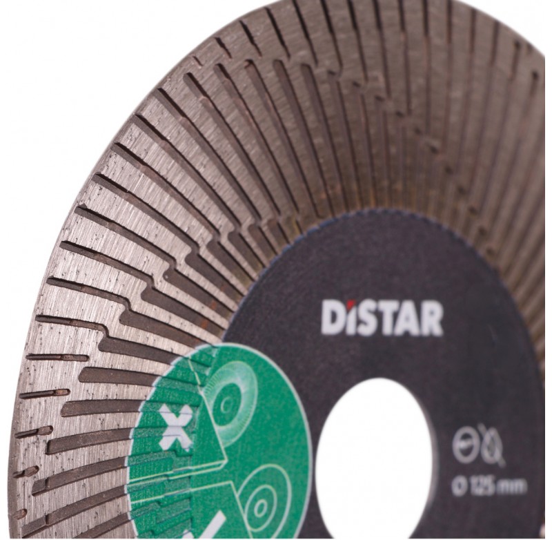 Під час різання турбована активна поверхня ефективно охолоджує зону різу, а крупні алмази забезпечують швидке прорізання керамограніту. Протилежна гладка поверхня з дрібним алмазом і м’якою зв’язкою делікатно підшліфовує кромку чистової поверхні.