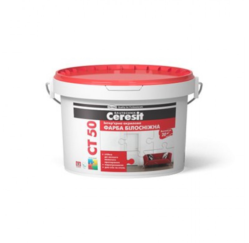 Акрилова біла фарба Ceresit СТ 50 призначена для обробки поверхонь будівельних конструкцій та елементів усередині будівель з мінеральних основ (бетон, цегла, цементно-піщані штукатурки, гіпсові штукатурки та плити та ін.) та органічних основ (шпалери, полістирольні плити, стилі деревноволокнисті плити) у приміщеннях з нормальним експлуатаційним навантаженням. Можливе багаторазове ремонтне пере- фарбування без видалення попереднього шару. Чи не застосовувати для фарбування підлог.