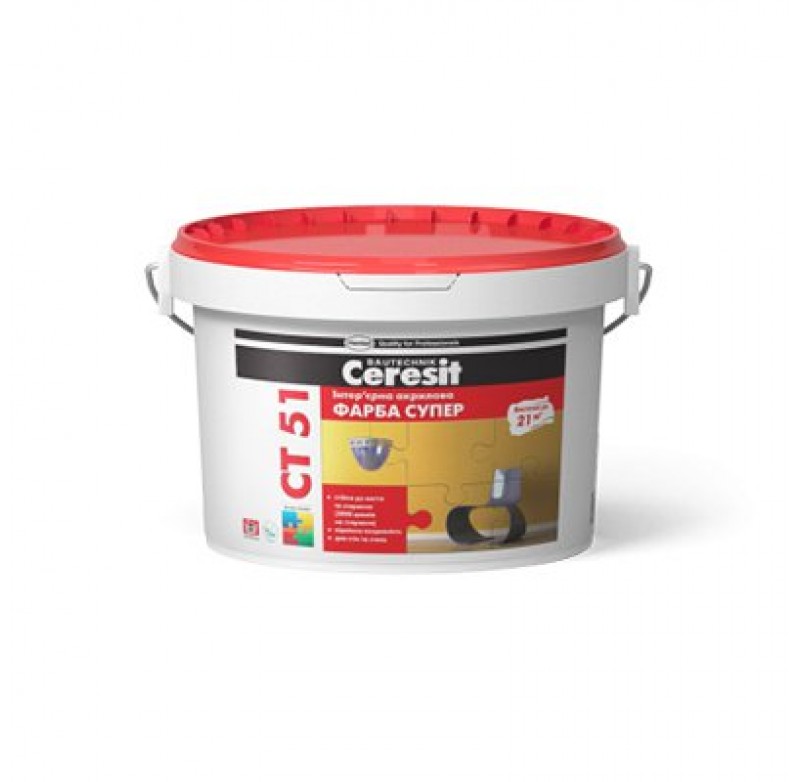 Акрилова біла фарба Ceresit СТ 51 призначена для обробки поверхонь будівельних конструкцій та елементів усередині будівель з мінеральних основ (бетон, цегла, цементно-піщані штукатурки, гіпсові штукатурки та плити та ін.) та органічних основ (шпалери, полістирольні плити, стилі деревноволокнисті плити) у приміщеннях з нормальним експлуатаційним навантаженням. Допускає миття з використанням побутових миючих засобів. Можливе багаторазове ремонтне перефарбовування без видалення попереднього шару. Чи не застосовувати для фарбування підлог.