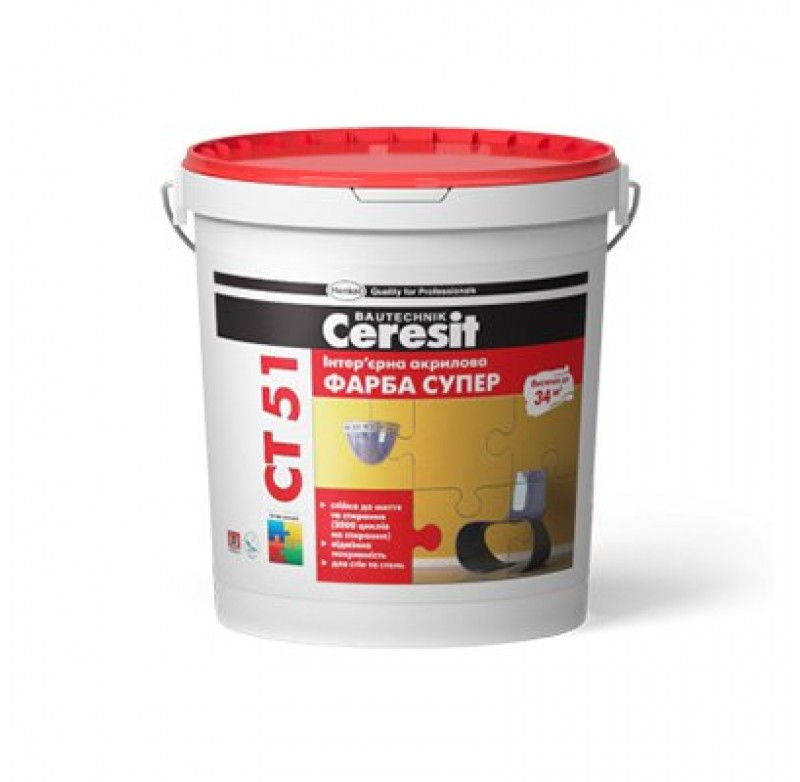Акрилова біла фарба Ceresit СТ 51 призначена для обробки поверхонь будівельних конструкцій та елементів усередині будівель з мінеральних основ (бетон, цегла, цементно-піщані штукатурки, гіпсові штукатурки та плити та ін.) та органічних основ (шпалери, полістирольні плити, стилі деревноволокнисті плити) у приміщеннях з нормальним експлуатаційним навантаженням. Допускає миття з використанням побутових миючих засобів. Можливе багаторазове ремонтне перефарбовування без видалення попереднього шару. Чи не застосовувати для фарбування підлог.