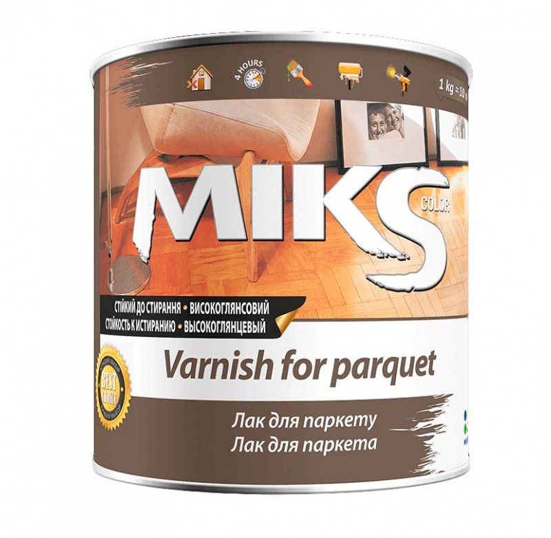 Лак паркетний Miks Color уретановий призначений для покриття паркетних і дерев'яних підлог. Для дерев'яних елементів конструкцій, експлуатованих всередині приміщення, включаючи вікна і двері, залишає малюнок поверхні дерева чітко видимим. Лак можна наносити також на вироби, покриті олійними або алкідними фарбами. Властивості матеріалу: Підкреслює структуру дерева; Високий блиск; Висока адгезія і зносостійкість; Стійкість до миючих засобів; Відсутність осаду і поверхневої плівки при тривалому зберіганні. Алкідний лак наноситься на поверхню методом розпилення, пензлем, валиком на суху підготовлену поверхню. Нові дерев'яні поверхні рекомендується заґрунтувати лаком, розведеним уайт-спіритом на 10-20%, потім покрити нерозбавленим лаком в 2 шари. Мінімальна температура фарбування - 10 °С.